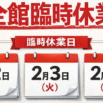 2026年1月5日 / 最終更新日 : 2026年1月30日 matsuzaka01 NEWS 2月2.3.4日全館臨時休業のお知らせ 誠に勝手ながら、2026年2月2日(月)・3日(火)・4日(水) の3日間は、館内設備点検およびメンテナンス作業のため、全館を臨時休業 とさせていただきます。 お客様には大変ご不便・ご迷惑をおかけいたしますが、安心して快 […]