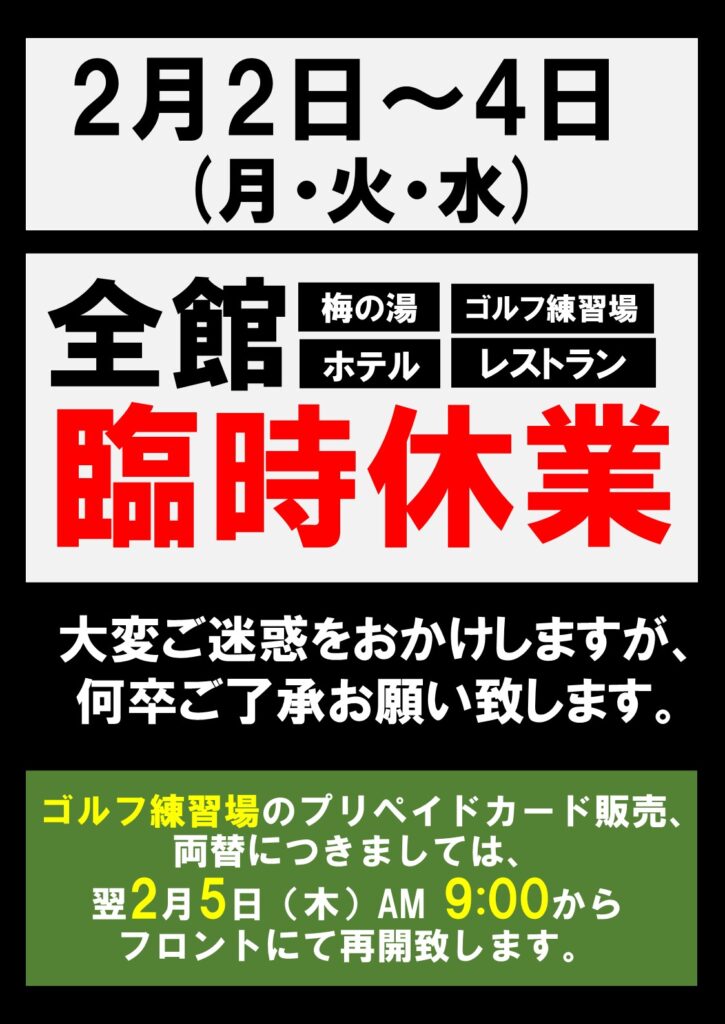 館内設備点検およびメンテナンス作業のため、全館を臨時休業 とさせていただきます。