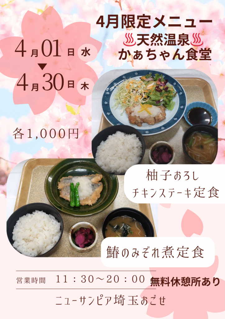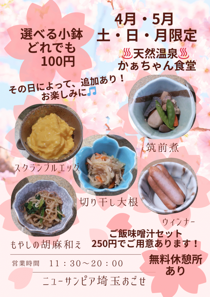 天然温泉でゆっくりくつろぎながら、かあちゃん食堂の春限定メニューをぜひお楽しみください。