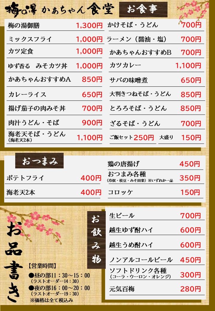 | かあちゃん食堂 | 11時30分~15時00分(ラストオーダー14時45分) 16時00分~20時00分(ラストオーダー19時45分) |
